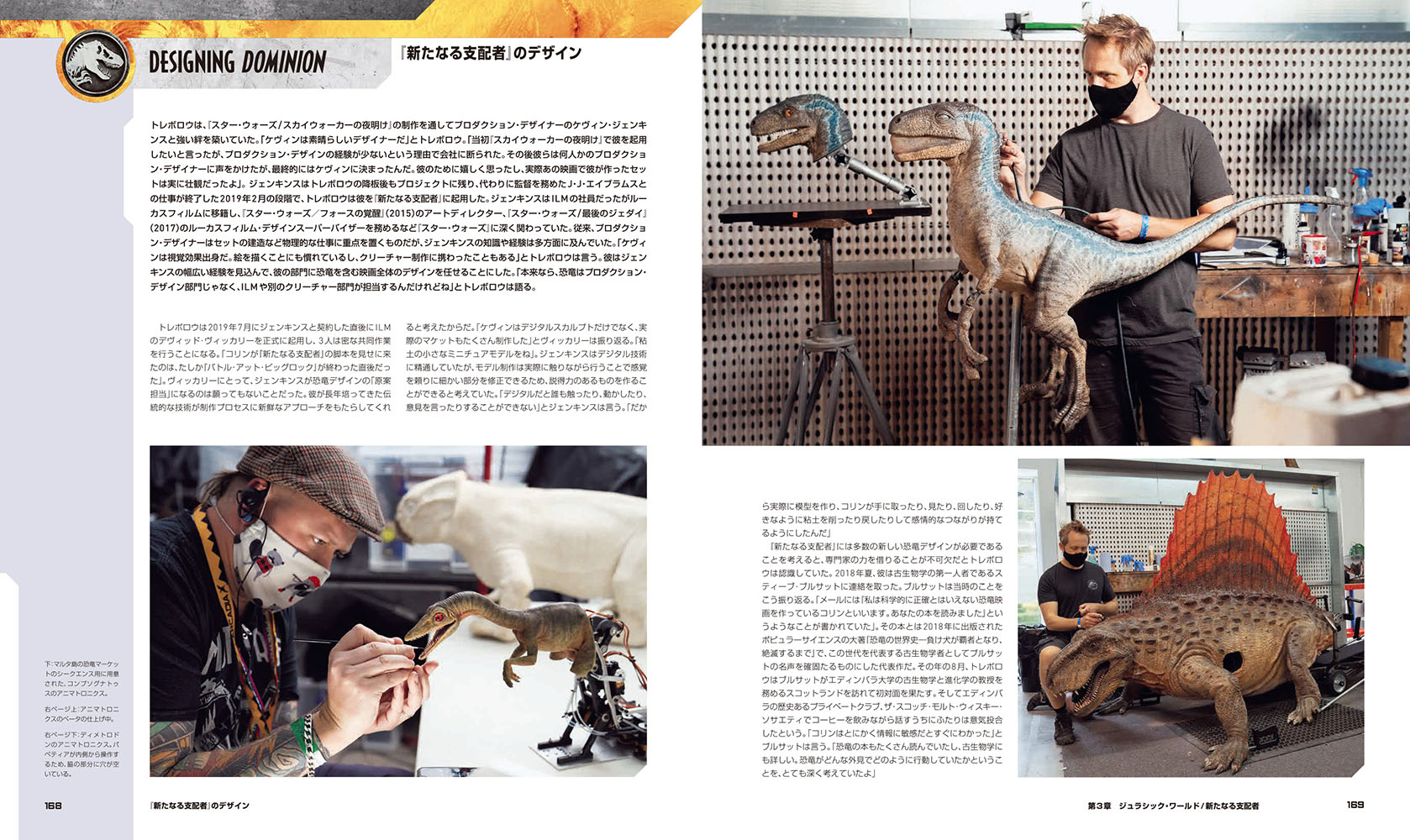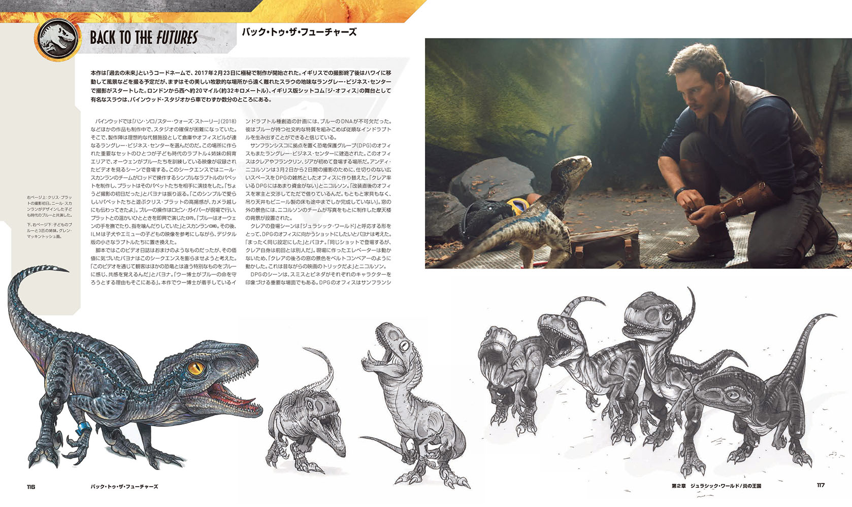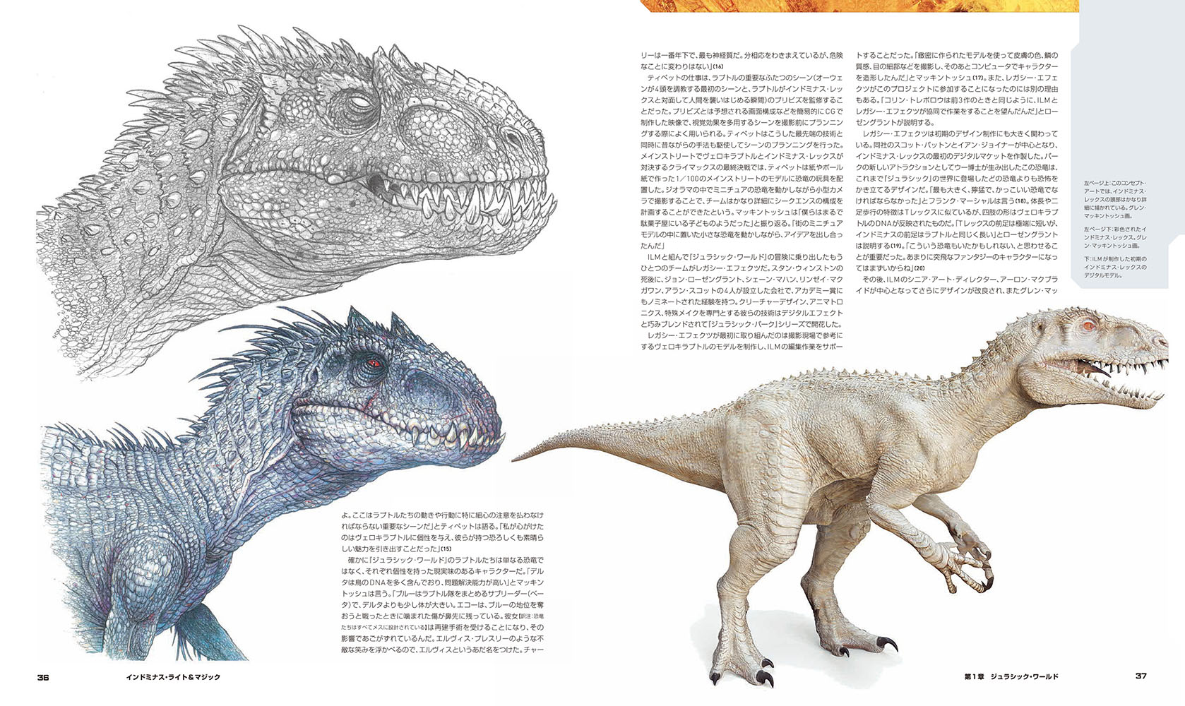 ในส่วนของไดโนเสาร์สายพันธ์ต่าง ๆ นอกจาก T -Rex, Raptor, Brachiosaurus, Triceratops, Indominus Rex และ Indoraptor... ก็มีการออกแบบไดโนเสาร์สายพันธ์ใหม่ เช่น  Indominus Rex และ Indoraptor เพื่อเพิ่มความน่าสนใจ โดยมีการเผยภาพวาดการออกแบบตัวละครและฉาก ผสมผสานไปกับภาพดิจิทัลและเอฟเฟกต์ที่ใช้งานได้จริง ซึ่งในหนังสือเล่มนี้จะอธิบายขั้นตอนการผลิตไดโนเสาร์ อันได้แก่ การเลือกใช้วัสดุไปจนถึงวิธีการใช้งานวิชวลเอฟเฟกต์ที่ทำให้ไดโนเสาร์ดูราวกับมีชีวิตจริง ๆ