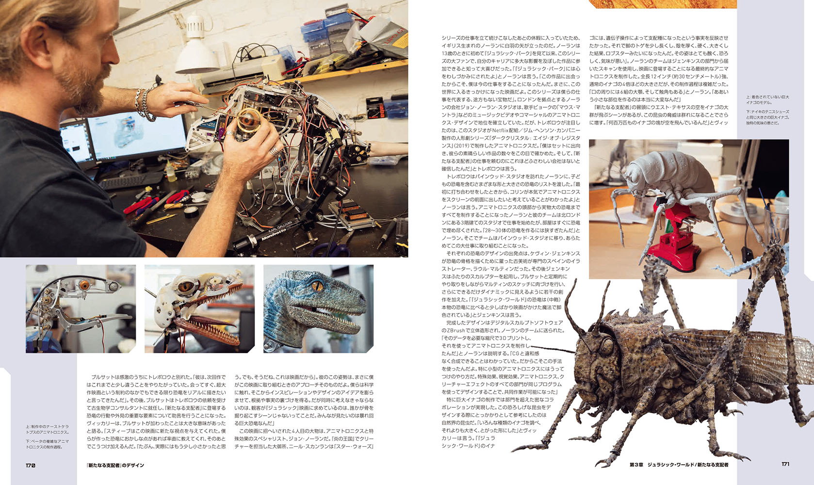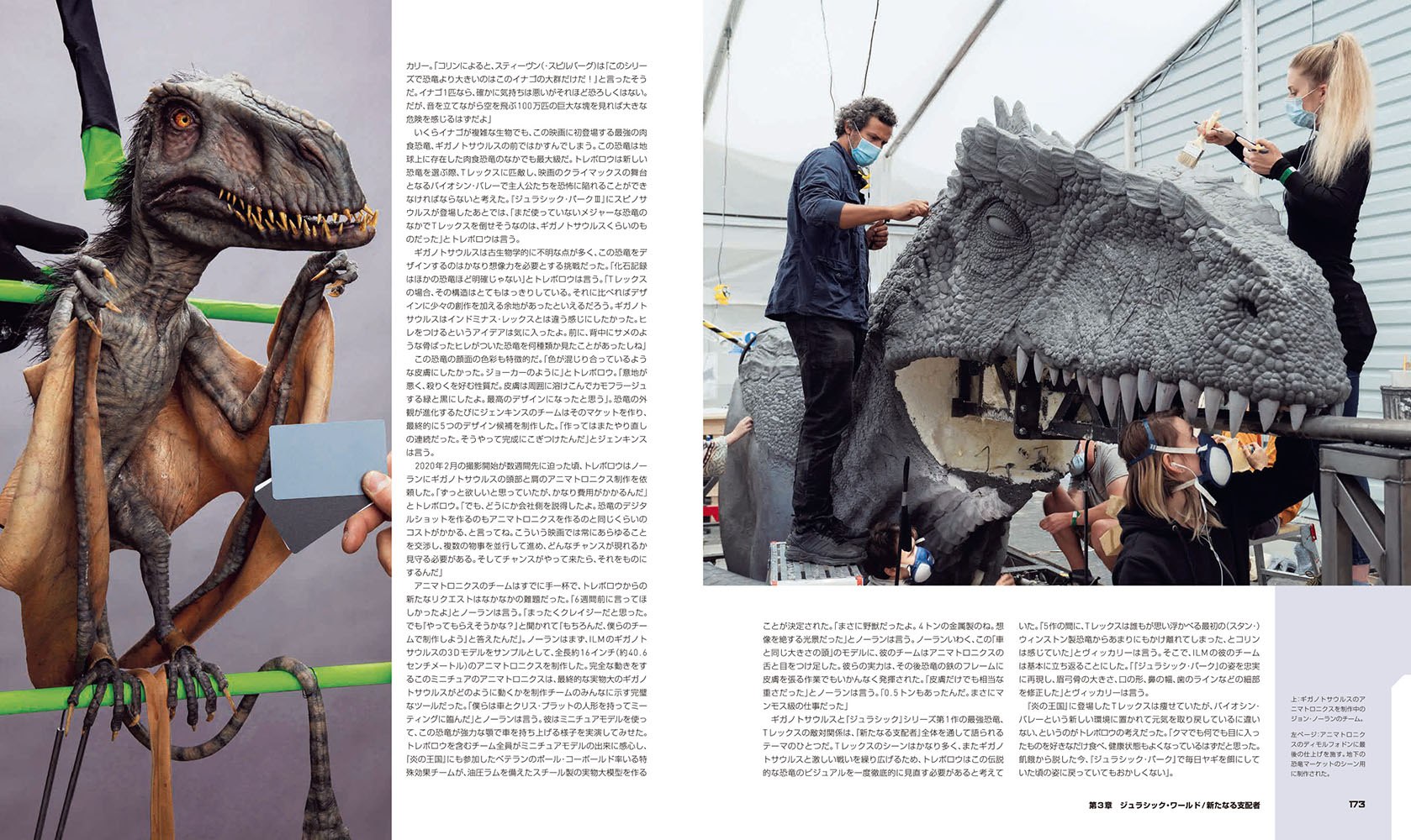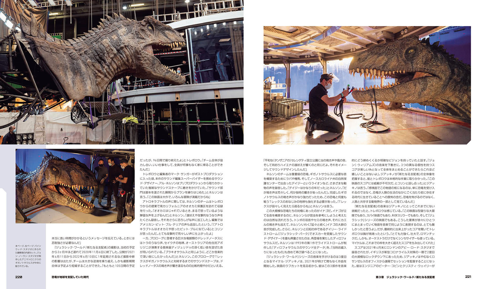 ในส่วนของไดโนเสาร์สายพันธ์ต่าง ๆ นอกจาก T -Rex, Raptor, Brachiosaurus, Triceratops, Indominus Rex และ Indoraptor... ก็มีการออกแบบไดโนเสาร์สายพันธ์ใหม่ เช่น  Indominus Rex และ Indoraptor เพื่อเพิ่มความน่าสนใจ โดยมีการเผยภาพวาดการออกแบบตัวละครและฉาก ผสมผสานไปกับภาพดิจิทัลและเอฟเฟกต์ที่ใช้งานได้จริง ซึ่งในหนังสือเล่มนี้จะอธิบายขั้นตอนการผลิตไดโนเสาร์ อันได้แก่ การเลือกใช้วัสดุไปจนถึงวิธีการใช้งานวิชวลเอฟเฟกต์ที่ทำให้ไดโนเสาร์ดูราวกับมีชีวิตจริง ๆ