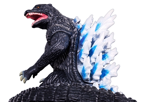 The pose of "MOVIE MONSTER Jumping Godzilla (2004)" is based on the movie poster created by the late art master Noriyoshi Narayori, who based the Millennium Godzilla prototype created by monster sculptor Yuji Sakai, when the movie "Godzilla: The Last Battle" was released. However, the overall design is based on the costume of Godzilla (2004) in the movie, reproducing its vermilion eyes, fierce facial features and muscular body. The dorsal fins are painted in gray-white and metallic blue, reflecting the color scheme presented in the movie poster.