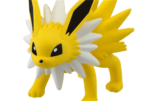 Jolteon is the evolved form of the Pokémon Eevee after it comes into contact with a Thunder Stone. It has organs in its lungs that can generate electricity, allowing it to inhale negative ions from the air and exhale high-voltage electricity of about 10,000 volts. Its neck and body are covered with sharp hairs, which stand up when it is angry or surprised. These hairs can not only generate weak currents to create lightning strikes, but can also be launched like missiles.