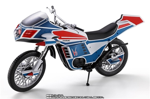 This figure faithfully recreates the Hurricane motorcycle that appeared in the opening sequence and throughout the Kamen Rider V3 series. Released in conjunction with the "SHFiguarts (True Bone Carving Method) Kamen Rider V3 Glorious Showa Rider Edition," the cowl and seat have been completely redesigned compared to the "SHFiguarts Hurricane" released in 2015. Furthermore, the figure pursues accuracy in reproducing the overall shape and size of the cowl, as well as the details of each part, through verification of footage and materials from the time. The coloring also pursues the impression from the show, with deep shades of blue and red used for the distinctive body, and black coloring applied to the underside of the cowl at the front of the body.