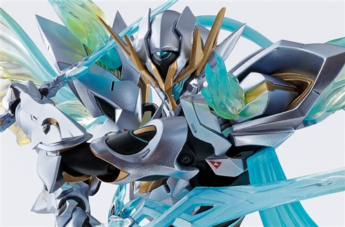 - Contents: Main body, 3 types of interchangeable wrist parts (left and right), interchangeable face parts (left and right), head aura effect parts, shoulder armor aura effect parts (large) (left and right), shoulder armor aura effect parts (small) (left and right), shoulder armor replacement parts (left and right), aura wing effect parts (left and right), swords x 2, pedestal joint parts, dedicated pedestal set