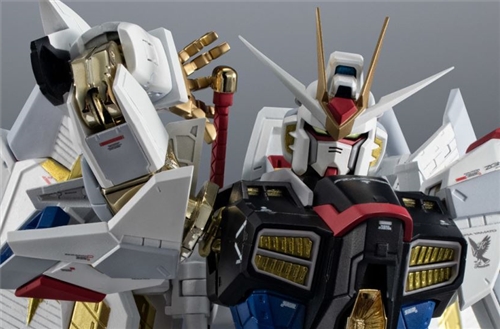Mighty Strike Freedom Gundam is made into a three-dimensional model from the "Super Alloy" brand using plating and die-casting. Gold plating is used mainly on the characteristic golden joints and the new "Proud Defender". The weapon ``Futunomitama'' has been given a solid color plating to reproduce the sparkle of the aircraft in the movie.