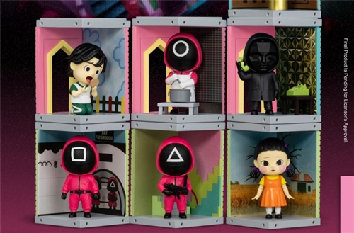Iconic characters include Player 456, the all-black clad Front Man, pink-suited workders with symbol masks (Manager - sqaure, Solider - triangle, Worker - circle), the chilling Young Hee Doll from "Red Light, Green Light", and the Golden Piggy Bank containing the grand prize o 45.6 billion won. Each figure is paired with an unforgettable scene, maning fans exclaim: "This is it!"