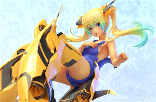 The healthy bare skin peeking out from the swimsuit with the shoulder straps removed, the beautifully flowing blonde twintails, and the mecha designed in detail are all expressed with meticulous sculpting.