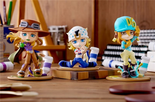 PalVerse is a series of chibi-style figure models based on the concept of "a new world in the palm of your hand." These figures feature a rich variety of character designs within a palm-sized format, and are also affordable for collectors. Their three main selling points are the diverse range of characters from anime, games, and VTubers. The " PalVerse Palé.JOJO's Bizarre Adventure: Wild Horse " box set includes Johnny Joestar , Gero Zeppeli , and Diego Brando. Each figure stands approximately 7-10 cm tall, is built in a 3-head-tall proportion, and features a stylish JOJO pose! Continuing the Palé series' paint theme, the base is designed as an oil paint palette, complete with paint bottles in the character's representative color and vividly applied paint—adding a sense of dynamism! The costumes and paintwork also feature exquisite details.