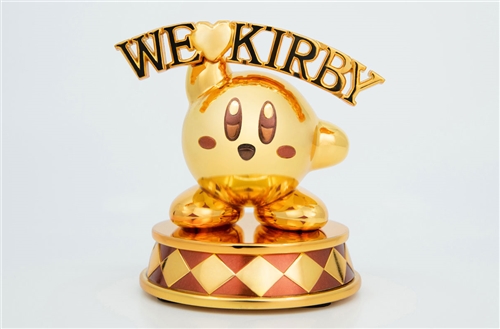 The statue is inspired by the "We Heart Kirby" sign that emerges from the ground at the end of the game. This statue has the same structural design as the pink version but is painted in a manner that helps to differentiate the different patterns on the statue. The gold edition of We Love Kirby is beautifully replicated by having the statue plated in gold. Kirby's black iris, blush, mouth have been plated with a darker, reddish gold which brings the layers of gold forward, making the structure more dynamic!