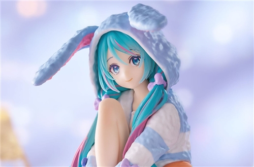 In this figure, FuRyu captures an adorable and relaxed moment of the character. The figure depicts Hatsune Miku wearing blue pajamas with a rabbit ear hood, in a sitting pose and with a tender expression. The details of her outfit and expression are meticulously recreated, making it a charming addition to any Vocaloid fan's collection.