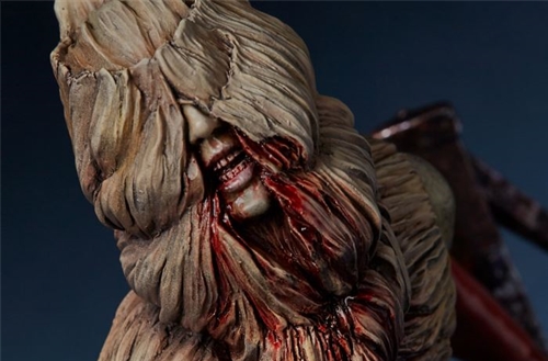 The hood along with dozens of wrinkles in the clothing have been painstakingly sculpted to give the character an eerie and haunting appearance. The tonfa-like weapons on both arms are realistically recreated with rust and stained blood. The rubber texture of the long gloves is expertly detailed in both sculpture and paint, making it an eye-catching point. His base features the image of Heather’s home and her father Harry, and the splattered blood highlights the dreadful murder scene.