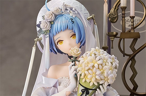 The figure features Zas in a demure pose with a serene expression on her face, with the details of her beautiful white wedding dress visable from behind her bouquet. The pitch-black gun in the gun case, the flower crown casting a light shadow, the lustrous tiara, delicate tulle dress and veil and lit metal candlestick all work hand in hand to give the figure a gentle and graceful atmosphere.