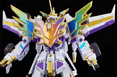 In its second form, the newly designed decorative parts are reproduced with holographic stickers. The missile hatches on the legs can be deployed just like the regular Dynazenon. The Dyna Sabers attached to both hands are made of clear parts.