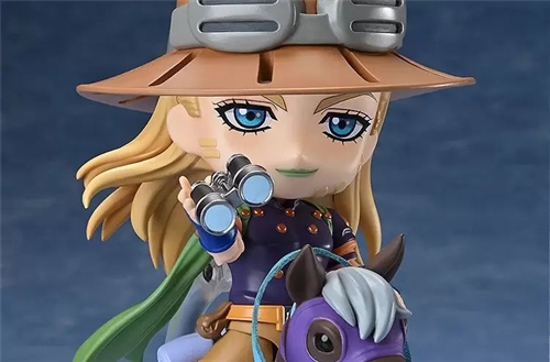 The " Nendoroid Gerald Zeppeli " posable figure, in a chibi style and a compact size of approximately 10cm, perfectly captures Gerald's blond hair, blue eyes, and dashing cowboy attire. Details such as the metal beads on his clothes and his signature belt buckle are rendered through paintwork. Three interchangeable face plates are included: a "cool face," a "hehehe face" showing off his gold teeth, and a "fighting face." Accessories include a "metal ball," "metal ball effect," and "binoculars," allowing you to enjoy scenes from the movie!