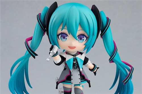 From "Character Vocal Series 01 Hatsune Miku," this Nendoroid is dressed in the outfit featured in the main visual for "Magical Mirai 2015." Facial expressions include a smiling face, singing face, and blowing a kiss. Optional parts include a microphone, cube, and heart effect, allowing you to recreate a variety of poses, including the one featured in the main visual.
