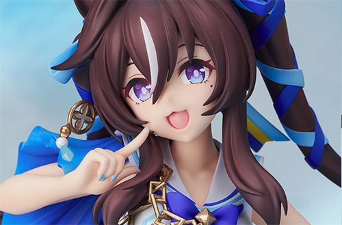 From "Umamusume: Pretty Derby" comes a scale figure of Vivlos, the youngest of the three Umamusume sisters, based on her illustration! The figure features Vivlos in her elegant blue and white Voyage etincelant racewear, which is decorated with gold embellishments. Details such as her physique which shows through her tight-fitting innerwear, the folds of her loose socks, flowy twintails and mischievous but adorable smile have all been meticulously brought to life. The original base features translucent gradated paintwork that highlights the charm of the figure. Be sure to add the devilishly charming Vivlos to your collection and admire her from a variety of angles!