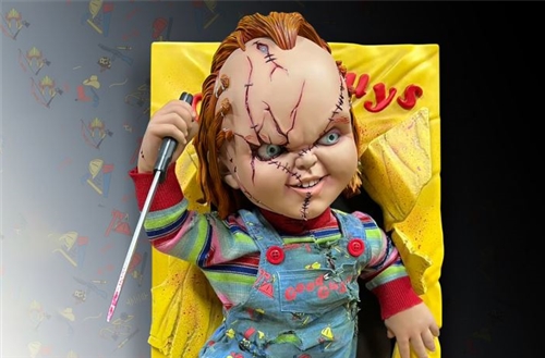 This life size sculpted wall art from Bride of Chucky captures the killer doll at his most unhinged, bursting violently from his iconic “Good Guys” box, knife in hand, mid mayhem.