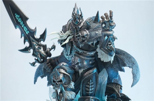 Alsace's pale face is faintly revealed under the ruler's crown, and the strands of long silver hair are fully dynamic through fine depiction. The metallic luster and blade mark pattern of the Lich King's full-body armor also fully demonstrate the realistic style through delicate carving and painting. The dark cloak lifted by the cold wind is full of elegance, and the texture of the fabric is also highly restored. The image of the Lich King holding Frostmourne, which contains terrifying power, and stepping on the ice rock is extremely oppressive.