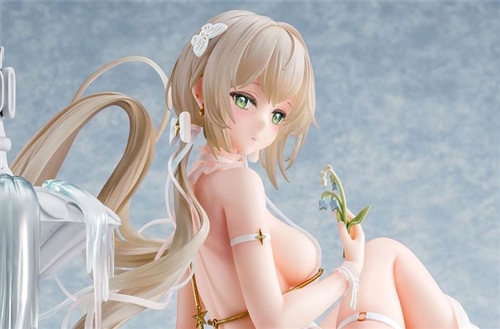 large crescent moon quietly shines on a terrace at dusk. Momoko's figure, gracefully perched on the edge of the fountain in this mystical setting, is a work of art. Her delicate appearance, bathed in moonlight and softly illuminated by a lily of the valley in her hand, is reminiscent of a "Lady of the Moon" blessed by the night sky. Hokiboshi's illustration, down to the stray locks of hair, is faithfully recreated, down to the fountain's fine details, in a luxurious, fully digitally sculpted representation, without compromising its graceful movements and delicate facial expression. The transparency of the pure white dress, woven from clear materials, sparkles in the light and shows different beauty depending on the angle, making it a true "three-dimensional jewel." Even the lightly flowing hair is finished so that each strand is imbued with a sparkle, bringing the worldview of Professor Hokiboshi straight to reality. At 1/6 scale, with a total height of approximately 22cm and a base width of approximately 20cm, it has an overwhelming presence. Each part is very firm yet voluptuous.