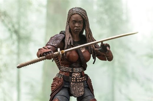 multiple joints throughout the body. Her iconic samurai spear and scabbard are both attached, and an additional combat cane is attached to help players reproduce Michonne's various smooth combat postures. The walkie-talkie is paired