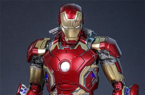 This Iron Man Mark 43 armor is made of alloy materials, standing approximately 32.5cm tall, and features 30 highly movable joints, creating a streamlined alloy armor. The armor surface uses a delicate metallic paint and weathering process to recreate battle wear, while the silver mechanical internal textures are subtly integrated with the gold and red armor, presenting a strong sense of futuristic technology and a realistic combat atmosphere.