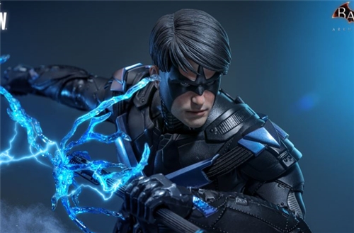 Based on the setting of Batman: Arkham Knight, Nightwing stands approximately 31 cm tall and features 30 articulation points. His figure is crafted from a form-fitting black, stretchy, leather-like fabric, with a detailed, textured finish achieved through a drop-coating process. The blue armor on his chest, shoulders, and limbs is specially painted, creating a dazzling, iridescent effect under varying lighting conditions. Accessories include his signature melee weapon, the Escrima Stick, a blue special-effect piece that creates an electric shock effect, a grappling hook gun with a grappling hook cable that can be attached to the gun's muzzle, and multiple interchangeable hands. The Escrima Stick can be detached for a variety of combat options.
