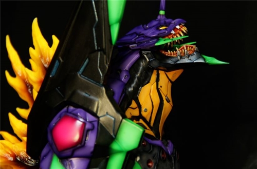 This is the third Godzilla Eva-01 kit, commissioned by a client to create a similar style of Guren model. We've used different techniques for some details compared to the previous set, adding more brushstrokes to enhance the three-dimensional effect. The burning areas have been slightly increased in size and their brightness has been increased. Other colors have been added to the metal parts to create a distinct look for each set. The creatures have also been brushstroked to enhance the effect of overlapping colors. We hope you enjoy this new creation!