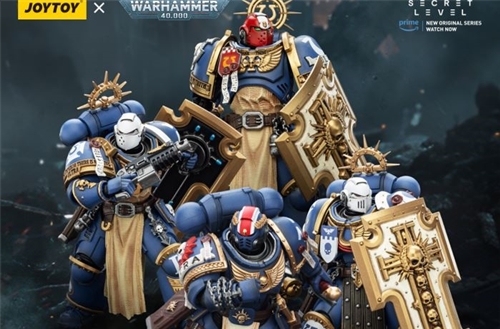 is equipped with an energy sword, a storm shield, and a bolt pistol.