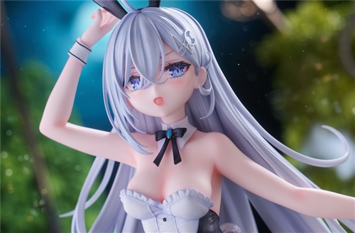 She's looking at us with a slight blush on her cheeks, and is charming as she gently pinches her bunny ears! Her clear blue eyes are sure to draw you in. The bunny suit fits her delicate body perfectly, and even the texture of the fabric is carefully crafted. The daringly open chest and long, slender legs really enhance the figure's beauty.
