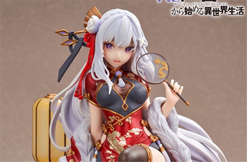 Emilia hides her smile behind a fan, her hair flows and spreads, and she has dropped one of her shoes. This figure captures her elegant features while also depicting a different side that Emilia rarely shows, culminating in an eye-catching masterpiece.