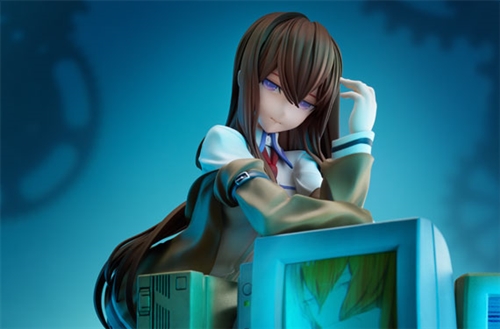 Her delicate silhouette, ephemeral expression, and even the texture of the tights on her supple legs have been carefully recreated. She rests her flexible body on countless CRT monitors displaying Amadeus, an AI based on Makise Kurisu's data, expressing a bleak worldline through their contrast.