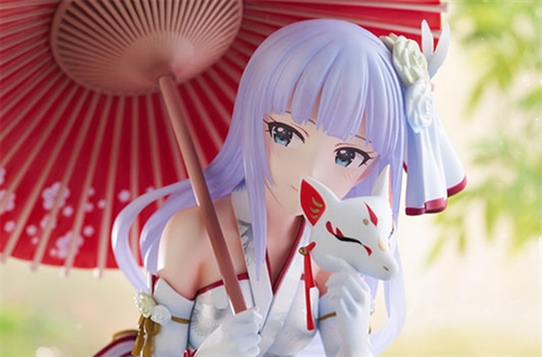 The figure is based on the "...Kon Tsumugi Shiraishi" illustration from THE iDOLM@STER MILLION LIVE! THEATER DAYS, where Tsumugi wears her "Celebrate Miyabi" outfit. This piece perfectly captures the moment when she looks this away while posed over a pond.