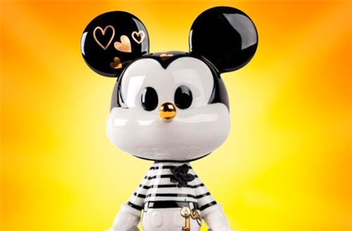 This creation is based on a contemporary vision of Mickey Mouse. The creative approach is based on animation techniques and brushwork in black and white ink. Here Mickey is decorated with drawings hand-painted on the porcelain that represent some of the most outstanding themes in Lladró’s imagery, such as love, nature and magic. The drawings also feature in the decoration of his t-shirt, his famous gloves, socks and shoes, all executed with great precision and at once in a light-hearted charming fashion. The black and white decoration is set off by a few well-chosen touches of golden luster in his nose or the keys hanging from his waist, the keys which Mickey uses to open hearts. Because if there is one character capable of speaking of goodness and love, then that is Mickey Mouse, and this is especially true in this creation.