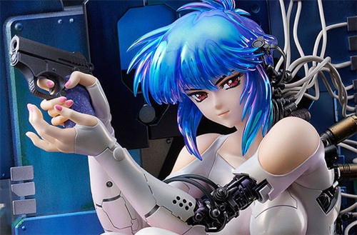 From the manga "Ghost in the Shell" comes a scale figure of Motoko Kusanagi! The figure is based on the cover illustration of the first tankobon volume, with additional details, and can be displayed standing like a photo frame. Sculpted by Chieri, a sculptor active since the 1980s, the figure retains the atmosphere from the era. Motoko's hair and boots are aurora-plated like an optical camouflage, and her expression changes depending on the angle the figure is viewed from. The contrast between the textures of her bodysuit and mechanical parts is one of the many visual highlights the figure has to offer. Actual cords are used for the cord details. The base is made with metal for a realistic look. Fans of the series, be sure to add this impressive figure to your collection!