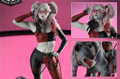 The statue, approximately 18.8 cm tall , depicts Harley Quinn on a display base along with her pet hyenas, Bud and Lou.