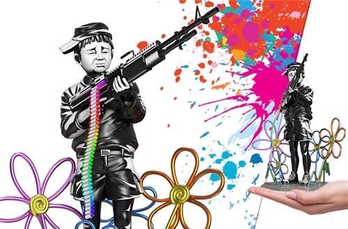 Standing among juvenile doodles of flowers, is a young boy manning a crayon loaded machine gun. The sad expression on his face underlines the seeming end of his innocence. Why is he wielding a machine gun when he should be doodling with crayons instead? Don't miss your chance to own this incredible art piece.