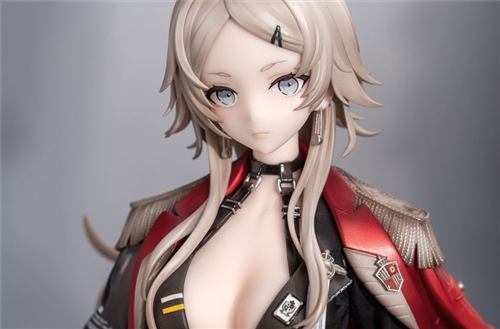 D wears a combat saber slung across her waist, her gaze fierce. Her red jacket features a multi-layered gradient paint scheme, while her plunging V-neck shirt reveals her bust. A black, hip-hugging miniskirt reveals a hint of flesh, and a silver belt cinches the shirt, creating delicate pleats. The transparent short sleeve on the right shoulder recreates the original design, while metallic paint accents enhance the details.