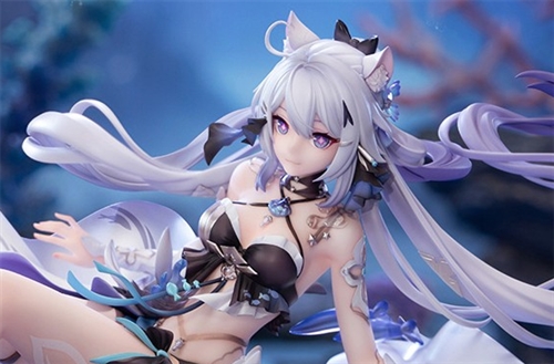 Kiana, clad in a dark, strappy swimsuit, floats gracefully amidst the azure waters. Her ombré ponytails sway with the current, while a charming cat-ear headpiece and a feline expression add a touch of playfulness. Surrounded by a school of fish, her tiered skirt resembles billowing waves. The white skirt is embellished with patterns of waves and fish, while the purple lining reflects the ripples of the ocean. The swimsuit's embellishments are accented with coral, seashells, and other elements, recreating the detailed character illustration.