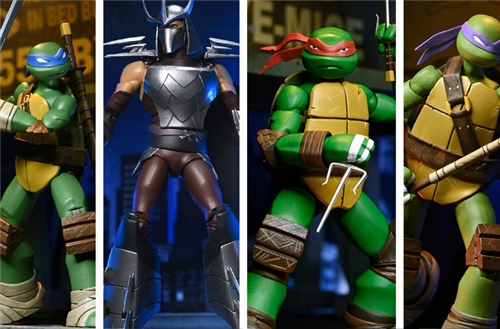 The line includes Raphael , Michelangelo , Donatello , Leonardo , and Shredder , all featuring sculpts and paintings that faithfully reproduce the style of the Nickelodeon series. Each character comes with interchangeable heads and hands , iconic weapons, Turtlecom , unique accessories, and collectible packaging illustrated by Ciro Nieli .