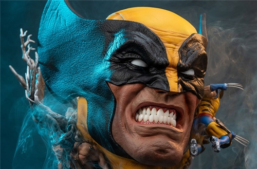 This figure stands approximately 48 centimeters tall and follows the series' consistent design style, featuring a beautifully crafted scene surrounding Wolverine's head. The highly prominent Wolverine head realistically portrays his angry, clenched-teeth expression, with the wrinkles and textures of the headgear meticulously sculpted. The teeth, made of acrylic, are remarkably neat and bright white, unexpectedly becoming the visual focal point (laughs).