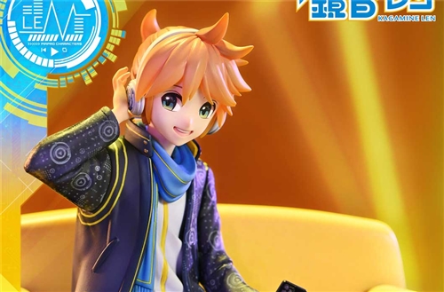 Lounging on a yellow sofa, fully immersed in his love for music—Len’s relaxed pose is faithfully captured from a cyberpunk-inspired illustration by the renowned artist.