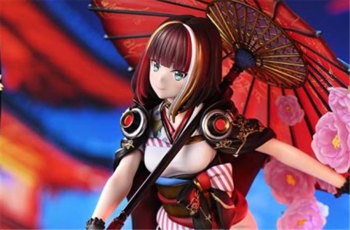 The figure’s exquisite features include accents of gold, silver, and red on the bangs, striking emerald green eyes, and cheeks delicately tinged with blush. Her soft, gentle smile perfectly mirrors the nuance of the original illustration. The richly detailed kimono, adorned with plum blossoms, the tech-enhanced sandals, and the graceful curves of her legs bring out the elegance of the character’s pose.