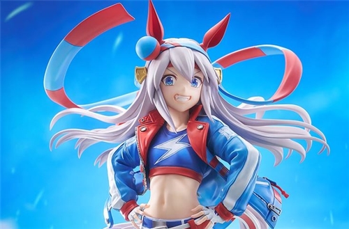 From the anime "Uma Musume Cinderella," Tamamo Cross, known as the white lightning, has been recreated as a 1/7 scale figure! Her sharp, biting smile and powerful, confident pose are captured in this model. The figure's flowing coat, long, curly gray hair, and tail create a sense of movement within the still image. The striking, all-encompassing blue and red costume design is meticulously recreated through detailed painting and modeling. Detailed, realistic details such as the stitching on the cropped pants, the metallic finish of the belt buckle, and the sneaker logo are also noteworthy. The pedestal features a "Zone" design, enhancing the sense of immersion in the world. Combined with the "Oguri Hat" (sold separately), you can recreate the passionate ensemble drama of "Uma Musume Cinderella." Take this figure home and admire it as it aims for the center position!