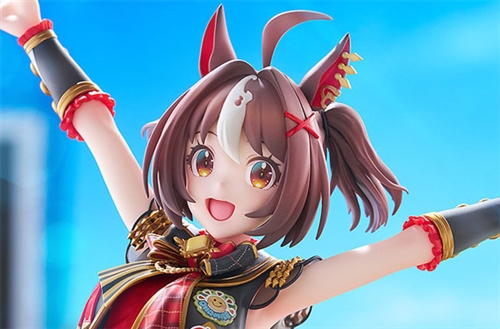 From the game "Umamusume: Pretty Derby" comes a 1/7 scale figure of Gran Alegria! Dressed in her Smile, My Way! racewear, the figure features Gran Alegria in a dynamic pose with her arms outstretched, bringing her bright and positive charm to life. Details such as the gold decorations on her black and red outfit, her crop top and slender legs have been carefully sculpted to create a natural and realistic look. Her short twintail hairstyle is designed to flow in accordance with her movements, allowing for a silhouette that is fun to view from any angle. The base of the figure is inspired by her unique greeting, "Ohamile", which is also featured as a motif in her racewear. An interchangeable winking face part and victory pose arm parts are also included for various display options!