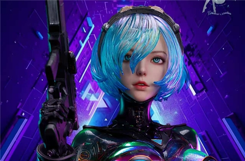 "Her snowy skin is shrouded in holographic fragments, her liquid metal armor morphs with her movements, her gentle features blend with her deadly weaponry—a dangerous aesthetic that beckons you to surrender to the future."