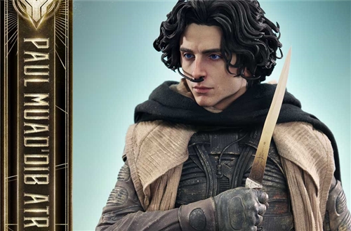 The gentle yet determined expression reflects both the likeness and inner strength of actor Timothée Chalamet, complete with vividly colored blue eyes, symbolizing his exposure to spice. The stillsuit is meticulously recreated, capturing every texture, flexible wrinkle, and the dust that recalls his life among the Fremen. The synergy of the stillsuit, jubba cloak, and custom base brings a rich sense of realism.