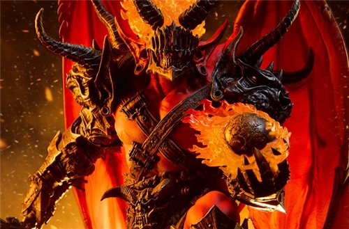 The Arethyr: War Statue measures 20.6” tall x 23.44” wide x 13.3” deep, capturing this hellion’s hunger for battle. The warmonger brandishes the flaming Aetherblade sword as he storms over a field of broken armaments and fallen fighters. His devilish form exudes brute strength, with leathery wings poised to unfurl. Arethyr is protected by wicked black armor forged in the ruthless fires of conflict, with monstrous horned pauldrons on either shoulder and a matching belt ornament across his waist. His grimacing portrait is guarded by a cage-like mask, crowned with a blazing tongue of fire.