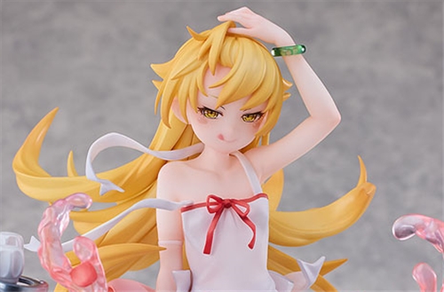 From the popular "Monogatari Series" comes an adorable plushie of the king of monsters, Shinobu Oshino in her white dress! Shinobu's provocative charm, from her beautiful flowing blonde hair to her smug expression, has been faithfully captured in figure form. Her adorable yet alluring appeal has been brought to life, with details such as her inviting gaze, mischievous stuck-out tongue and shoes hooked on her toes sculpted with upmost care. The base features a bathtub design inspired by the the iconic scene from the series. The use of translucent parts and delicate gradated paintwork add to the beauty of the figure. Be sure to add this luxurious figure of Shinobu to your collection!