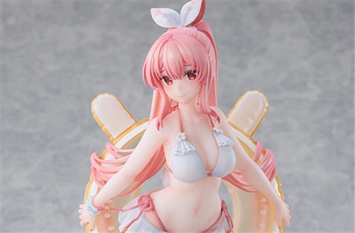 Popular illustrator Rosuuri's original character White Rabbit Rosu is now a scale figure in her summery swimsuit! Rosu wears a bashful smile that is sure to steal your heart. Her translucent skin, fluttering pink hair and rabbit ear ribbon accessory all work hand in hand to bring out her adorable charm. Her frilly white bikini and translucent rabbit-shaped swim ring give the figure a refreshing beach-like feel just like the atmosphere of the original illustration. Other details such as the seashells and beach bottles have been carefully sculpted and added to the base, which can be connected to the base that comes with Cheshire Cat Mika: Swimsuit Ver. Be sure to add Rosu and Mika to your collection!