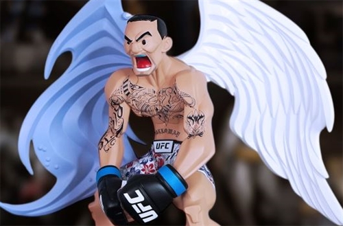 This UFC collectible of Max “Blessed” Holloway Wings edition is crafted by esteemed designer artist Tracy Tubera. This piece honors Holloway’s legacy by capturing his legendary UFC 300 victory celebration pose.