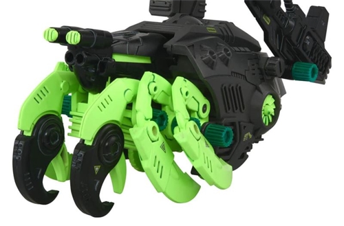 By flipping the switch on the electric unit, it performs running action while recreating the movement of a hermit crab's many legs. Some parts use phosphorescent parts that glow in the dark. There is an openable cover at the rear, and inside it are 12 missiles. The missiles act as switches to perform the electric action. The rear beam cannon also performs electric action, and the fans on the sides also rotate electrically. Each weapon can be manually transformed into a firing form. A 1/72 scale original soldier figure (unpainted) is included, which can be placed in the cockpit. By flipping the switch, you can switch between forward and backward movement.