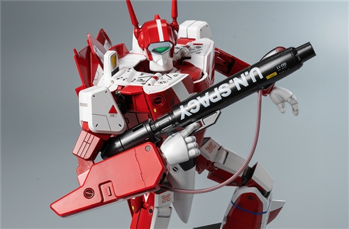 ROBO-DOU ROBOTECH VF-1J Veritech (Miriya Sterling) stands approximately 8” (20.3cm) tall in Battloid configuration, and can be fully-transformed between Fighter, Guardian, and Battloid modes. The zinc alloy die-cast interior frame provides a total of 109 points of articulation with an impressive range of movement. Accessories include the GU-11 Gunpod, four sets of Missiles, and four pairs of interchangeable hands.
